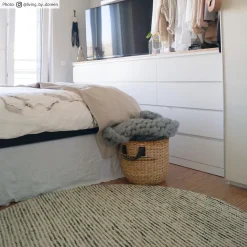 Plat geweven vloerkleed van wol. Wollen vloerkleed met dunne, mooie snit. Geweldige kwaliteit. Makkelijk te verplaatsen. Ligt stevig en plat op de vloer. Geeft een gevoel van originaliteit.