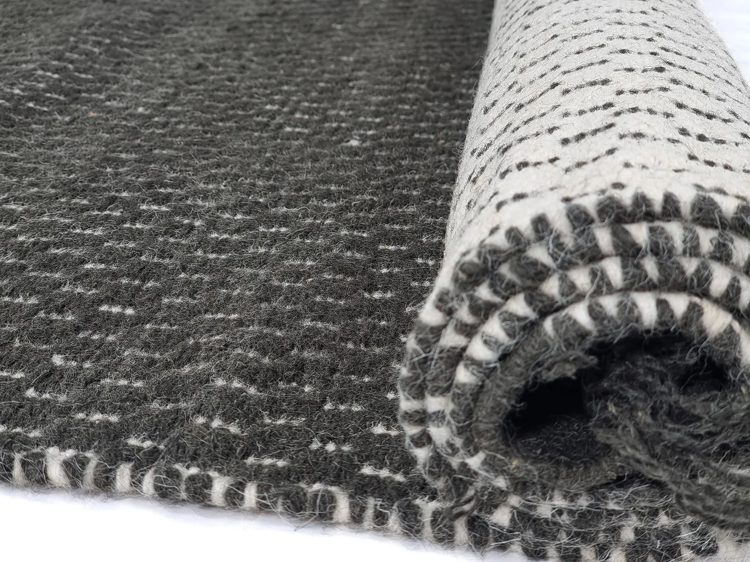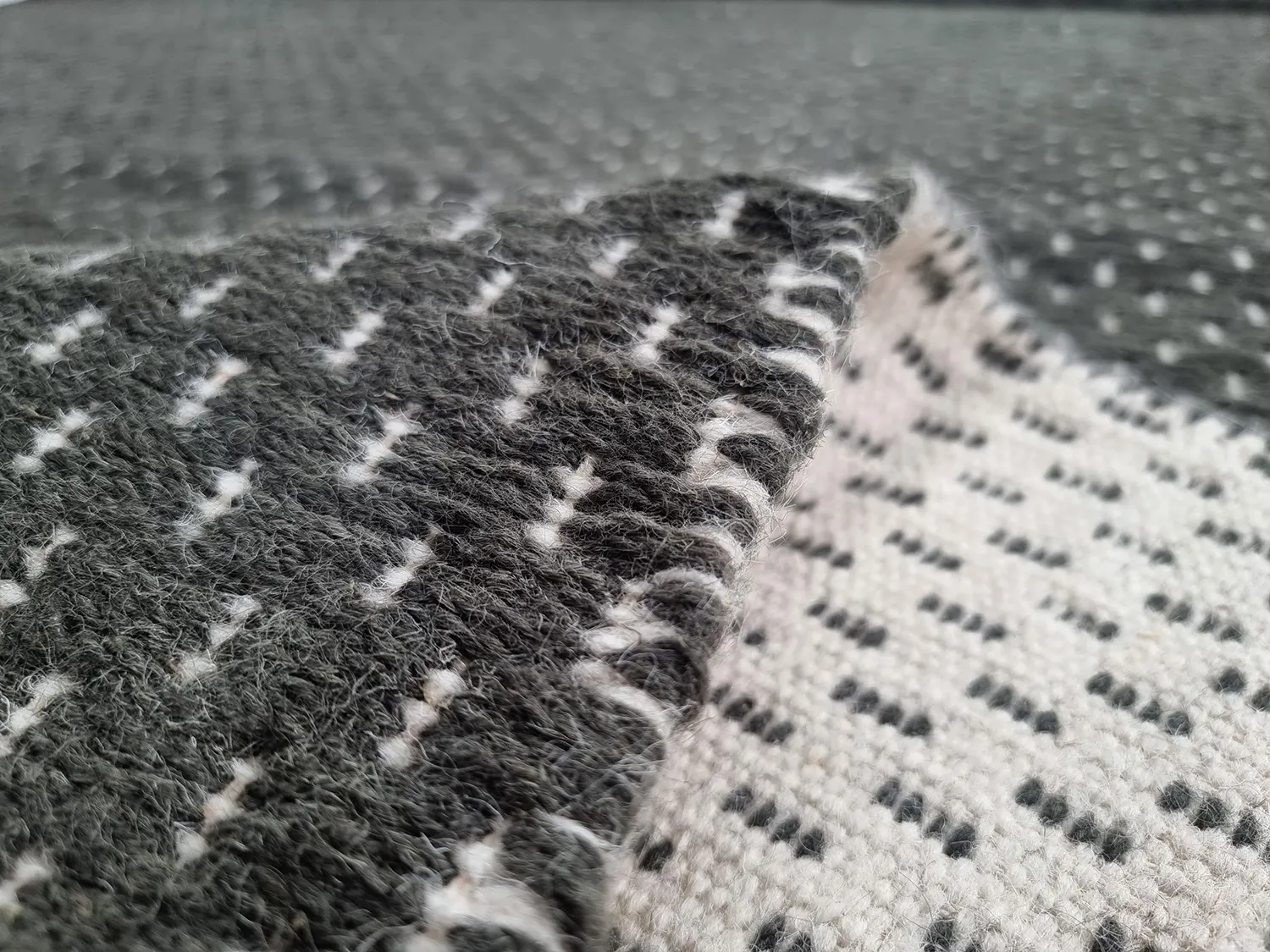 Plat geweven vloerkleed van wol. Wollen vloerkleed met dunne, mooie snit. Geweldige kwaliteit. Makkelijk te verplaatsen. Ligt stevig en plat op de vloer. Geeft een gevoel van originaliteit.